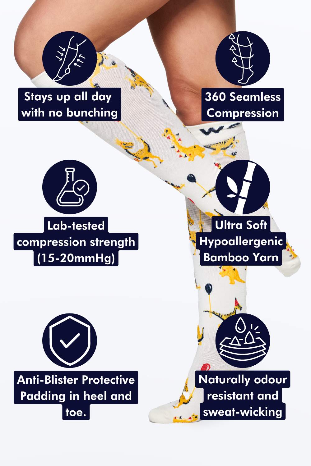 Our Dino Party Compression Socks combine the comfort and luxury of bamboo fabric with 360° seamless compression.