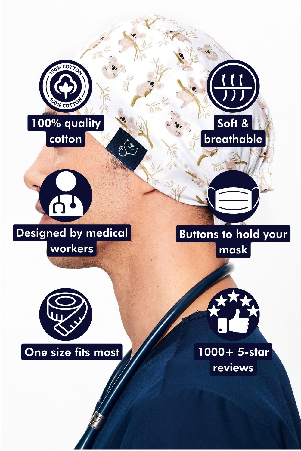 - Our Tie Back Scrub Caps fit almost all heads.