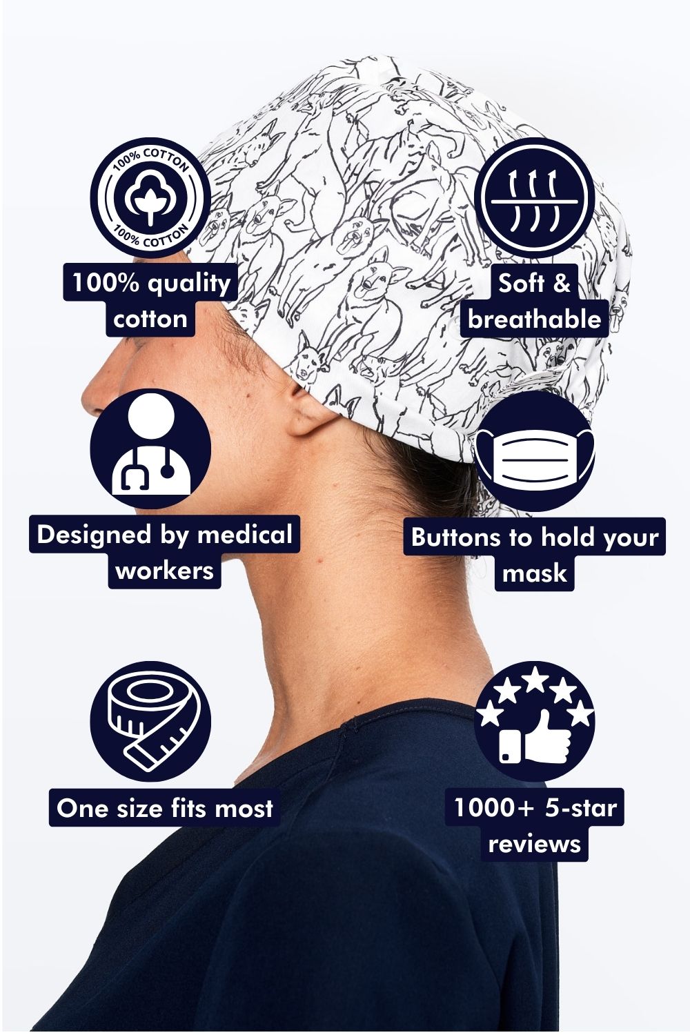Tounges are out & tails are wagging! If the happy doggos on our 100% cotton German Shepherds scrub cap don’t make you smile, we’re pretty sure nothing will.