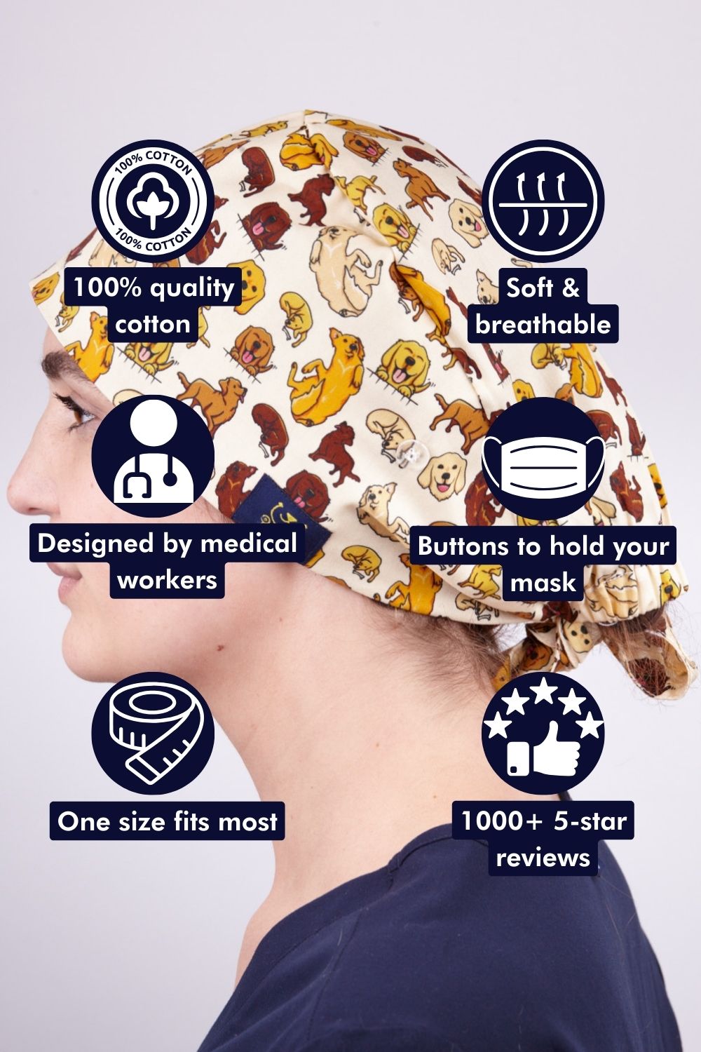 With super-soft fabric and buttons to hold your mask, our Labrador scrub cap is 100% cotton and 100% comfortable.