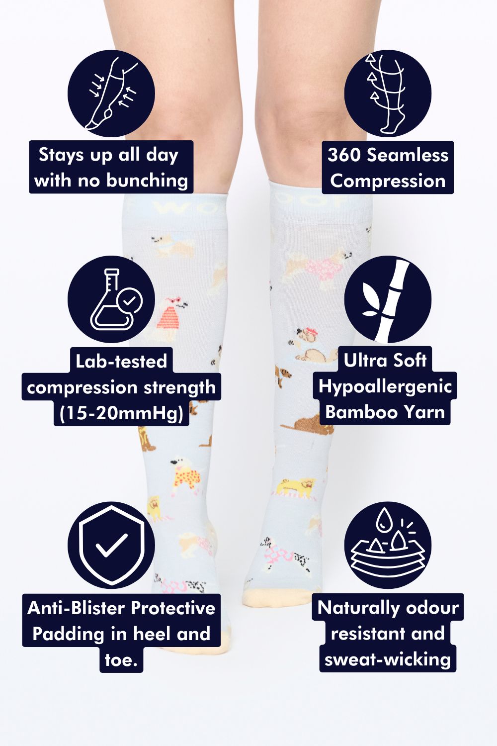 Our Parisian Pups Compression Socks combine the comfort and luxury of bamboo fabric with 360° seamless compression.
