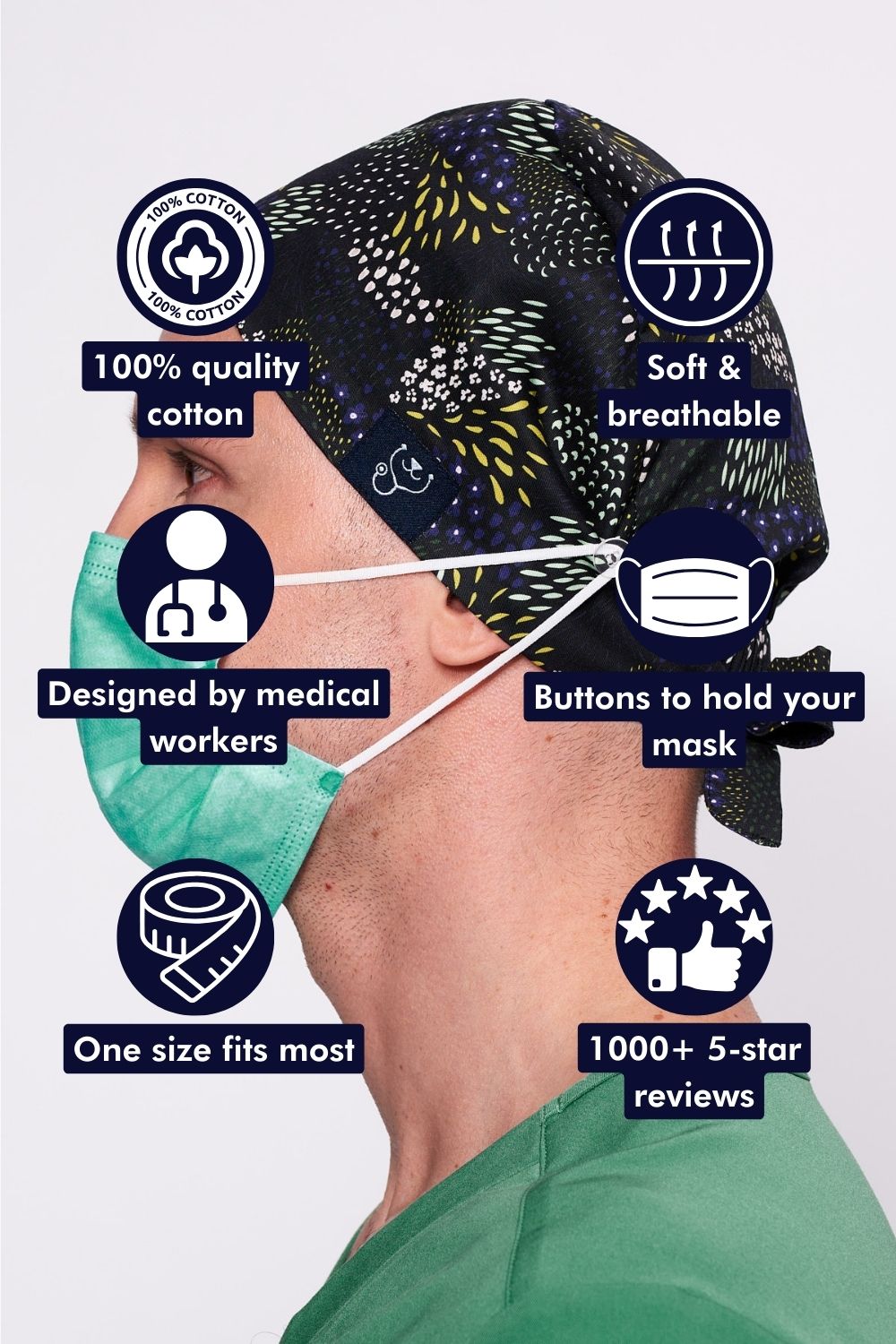 - Our Tie Back Scrub Caps fit almost all heads.