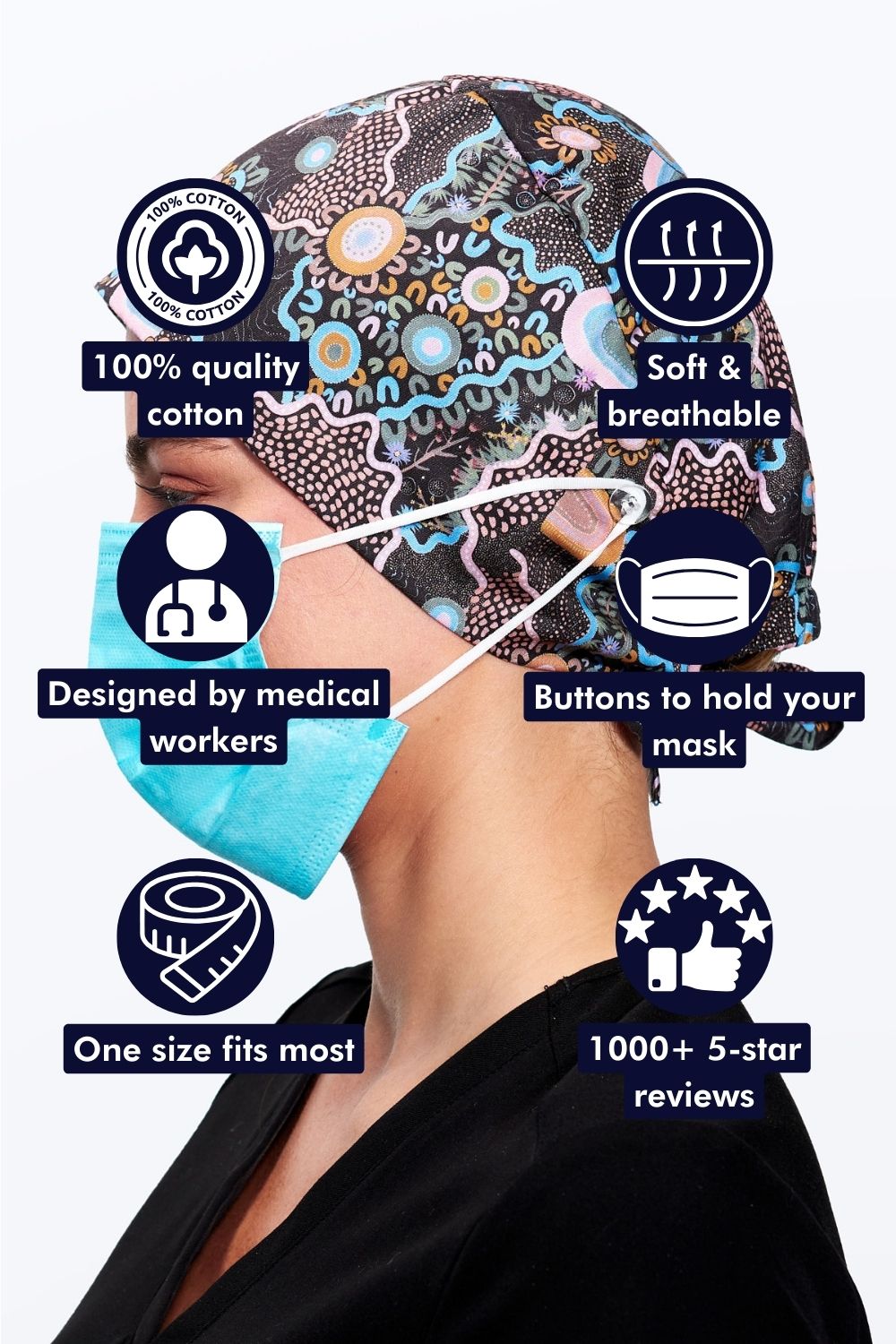 Like all our 100% cotton caps, Two Worlds Scrub Cap is:
